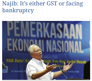 Atau dalam lain ayat.. jika tidak dilaksanakan GST negara akan muflis atau bangkrap!!.. Bangkrap di bawah pentadbirannya sebagai Perdana Menteri yang juga Menteri Kewangan